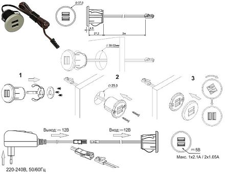 Зарядное устройство встр. 2хUSB (2х1,01А/1х2,1А) DC5В серебр., пласт. корп.