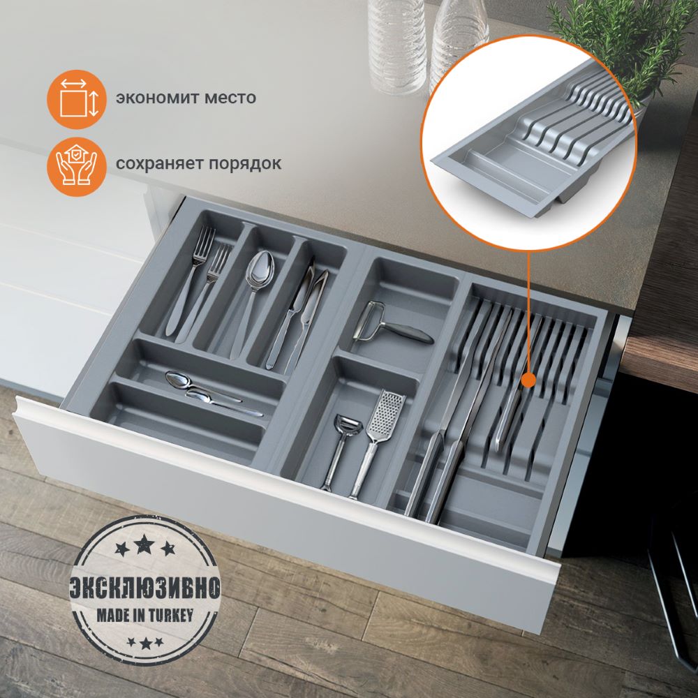 • Насечки по периметру изделия для ровного обрезания ширины и глубины лотков под размер кухонного ящика.