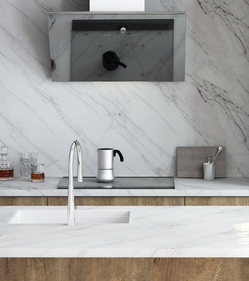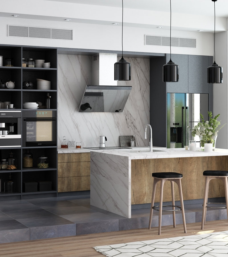 Воплотите Вашу мечту о прекрасном со столешницей Мрамор Неаполь. Холодные оттенки серого отлично гармонируют с легкими тонами розового. Своим внутренним светом декор визуально расширяет пространство и задает доминанту в кухонном интерьере.